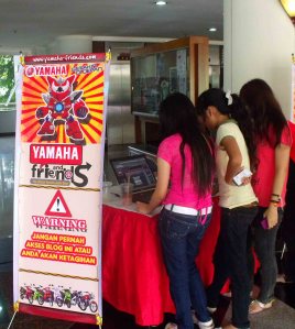 Mulai tanggal 23-26 Yamaha ada Roadshow ke kampus-kampus dan andalannya dalam menggebrak adalah menggunakan Yamaha Xeon dengan mengandalkan Social media, Para mahasiswa diajak bergabung dengan FB Xeon di Xeonizer Yamaha dan BLog Yamaha-friends, bagi yang bergabung ada hadiah langsung berupa Tumbler (bener ga ya tulisannya) mouse pad, dan ada juga Doorprize berupa Jaket, hadiah utamanya adalah Laptop dan Blackberry…lagi-lagi saya garing ga oleh BB wkwkwk
