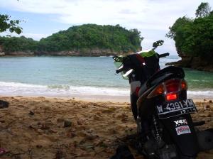 Memasuki daerah kepanjen kami disambut dengan jalanan yang rusak, emangnya ada ya jalan di Indonesia yang mulus xixixi, jam setengah satu akhirnya rombongan sampai dengan selamat tanpa kendala yang berarti, memasuki daerah wisata pantai ngliyep membayar tiket masuk sebesar 5000/orang sampai didalam ternyata ada 2 arah pantai yang diportal, ke kiri masuk ke areanya perhutani bayar tarif lagi 5500/orang lalu yang ke arah kanan ke pantai panjang ngliyep diportal warga sekitar dan harus bayar 3000 per motor untuk masuk, weleh oknum pemda, perhutani dan warga rebutan lahan nie 😀 akhirnya diputuskan masuk dari pantai panjang aja lalu berjalan kaki mengelilingi pantai, dan ternyata keindahan pantai ini juga tidak kalah bagusnya, apalagi diantara perbukitan ada pantai yang tersembunyi dan sangat indah, cocok buat foto prewed nie ga perlu jauh-jauh ke bali hehehehe