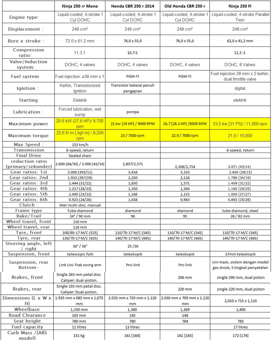 kalau dlihat power mesin Ninja mono dan CBR memang lebih bagus CBR. tapi kalau soal bobot Ninja mono lebih ringan, selisih 10KG (gila selisihnya cukup banyak jg). Padahal rangka Ninja mono lebih komplex