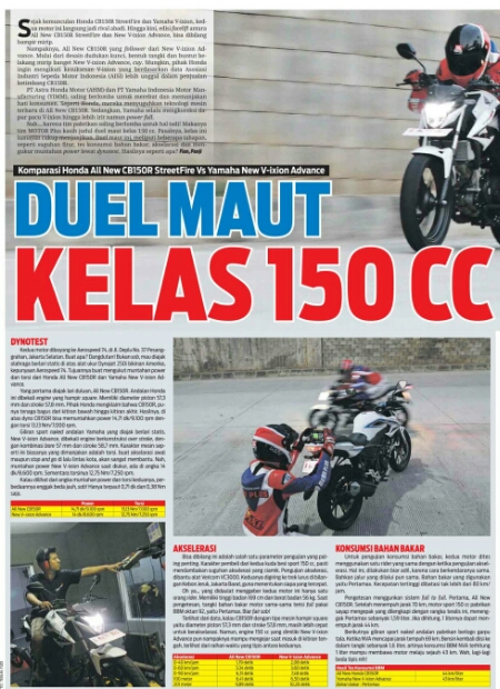 hasilnya All New CB 150r unggul telak disemua sektor, dari hal Power, Torsi,fitur, sampe keiritan bahan bakar, hal ini cukup mencengangkan karena melihat spesifikasi Yamaha Vixion yang SOHC overstroke harusnya bisa unggul di bagian torsi dan keiritan bahan bakar!!