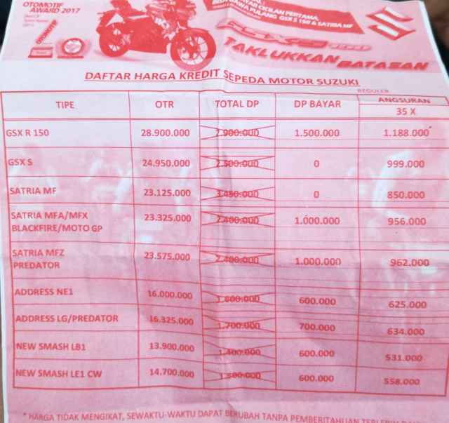 nah diacara tersebut selain banyak sekali acara-acara yang sifatnya menghibur, dengan puncaknya penampilan NDX AKA, ada juga promo pembelian, bagaimana untuk pembelian GSX-S cukup hanya bayar angsuran pertama 999ribu, sudah bisa bawa pulang motornya! berikut daftar harga OTGR motor Suzuki 2017