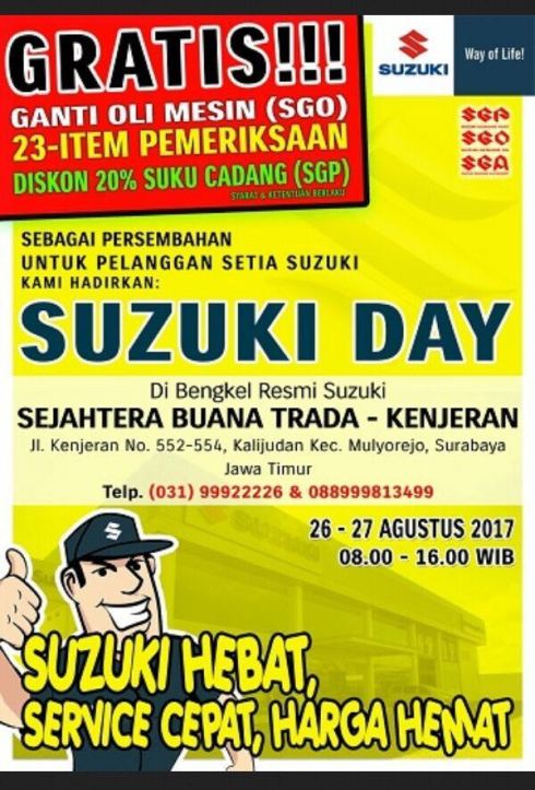 Bertempat di Jalan kenjeran no 552-554, Suzuki telah mengadakan Suzuki Day yang ke-43, rangkaian acara ini sangat spesial karena memberikan layanan aftersales yang keren bagi konsumen setia Suzuki Roda 4, tiap unit kendaraan yang datang akan mendapatkan Gratis penggantian Oli, free pengecekan 24 item standart pabrik! gratis pemerikasaan sistem kelistrikan, pemeriksaan fungsi-fungsi fluida pada kendaraan, hingga ada diskon hingga 20% untuk sparepart original!
