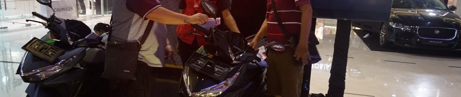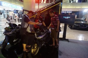 Sales Honda memberikan penjelasan teknologi New Honda Vario 150 kepada pengunjung Vario Day yang digelar di Mall Bali Galeria, Kuta, Bali (18/11).