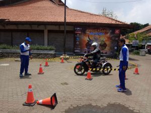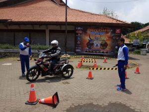 Sambil menunggu motornya dilakukan service, team safety riding MPM memberikan edukasi safety riding kepada anggota Komunitas difabel dan juga praktek safety riding untuk kendaraan roda tiga.