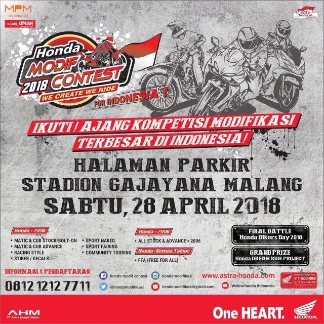 Hai guys! Mimin mau kasih tahu nih, kalau ada acara keren yang bakal diselenggarakan di Malang loh, acara yang digelar MPM, bertajuk Honda Modif 2018 Contest “We Create We Ride for Indonesia!” ini mengundang kamu, para modifikator Jawa Timur dan sekitarnya untuk bergabung!