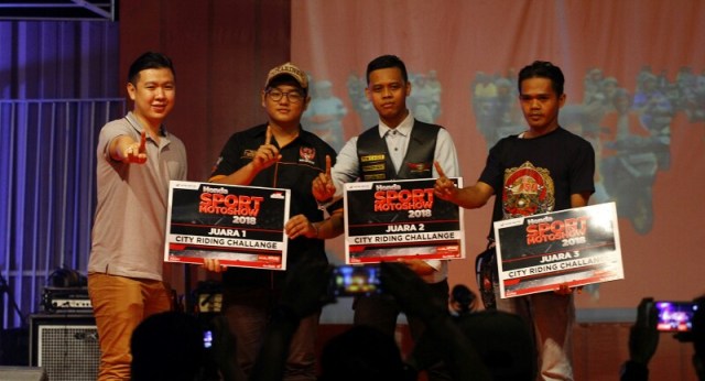(kiri) Area Sales Supervisor Astra Motor Yogyakarta Chrystian David secara simbolis menyerahkan hadiah kepada para anggota komunitas pemenang City Riding Challenge Honda Sport Motoshow 2018.