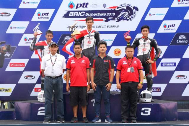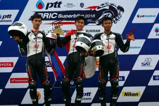 Pebalap binaan AHM, Herjun Atna Firdaus (tengah) dan Muhammad Hildan (kanan) berhasil meraih podium pertama dan ketiga pada balapan pertama di ajang Thailand Talent Cup 2018 seri ke 3 di Chang International Circuit, Buriram, Thailand (14/7).