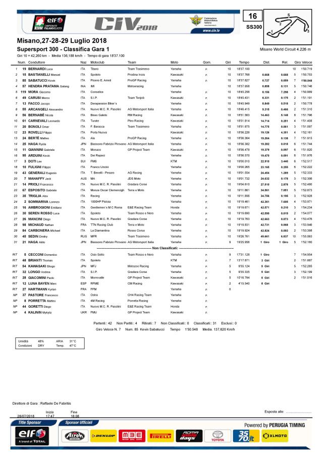 Hanya berbeda 0,858 detik dari Luca Bernardi (Team Trasimeno) yang finish terdepan. Tentu saja, hal demikian sebagai pencapaian yang luar biasa. Proses adaptasi petarung tim MotoX Racing ini berlangsung cepat. Terlebih kompetisi SS300 diramaikan 42 starter yang berasal dari berbagai negara.