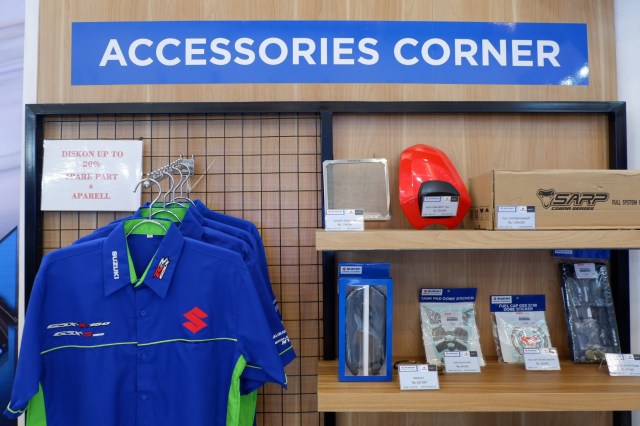 Bagi konsumen yang telah memiliki sepeda motor Suzuki pun bisa berbelanja produk aksesoris, apparel (SGA) maupun spareparts (SGP) dan pelumas (SGO) dengan harga yang lebih terjangkau, berkat diskon sebesar 20% yang diberikan. Pengunjung yang sedang melihat-lihat sepeda motor Suzuki pun juga bisa mendapatkan merchandise menarik dengan mengikuti beragam games yang tersedia di booth Suzuki.