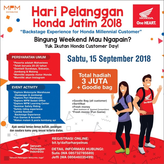 Buat kamu para Millenial! Ayo, isi weekend kamu dengan ikutan event seru Hari Pelanggan Honda Jatim 2018, bertajuk “Backstage Experience for Honda Millenial Customer,” Sabtu 15 September 2018.