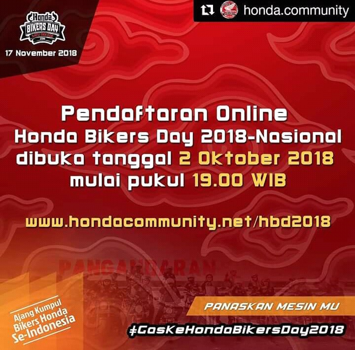 Dibuka hari ini, 2 Oktober 2018, bersiaplah untuk mendaftarkan dirimu secara online  di sini : http://www.hondacommunity.net/hbd2018.