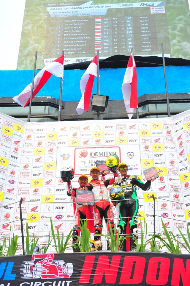 Rheza Danica Ahrens (Kiri) dan Awhin Sanjaya (Tengah) berhasil mendominasi podium ARRC kelas AP250 di balapan kedua yang digelar di Sentul International Circuit hari Minggu (14/10)