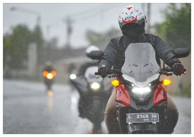 “Jaga jarak aman dengan pengendara lain karena pandangan terbatas. Serta lebih fokus dan sigap terhadap kondisi jalan. Misalnya jalan berlubang dan tergenang air.“ ujar Dionisius.