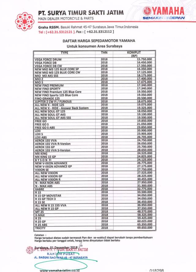 Kalo iya pas banget nih, soalnya harga motor Yamaha terbaru untuk kawasan Surabaya dan sekitarnya sudah keluar.