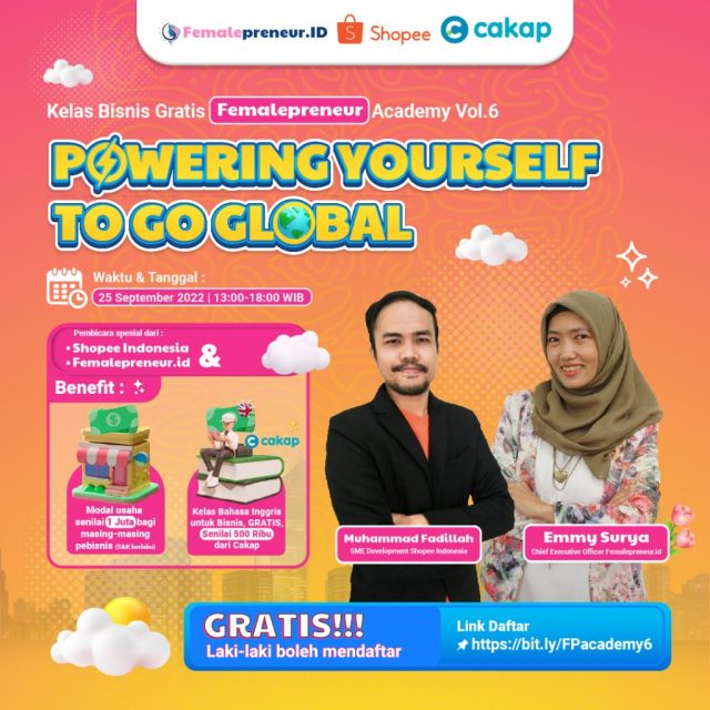 Sini, sini, aku kasih tau! FP Academy Vol. 6 bakalan hadir lagi nyapa temen-temen pengusaha hebat buat ikutan. Lewat tema “Powering Yourself to Go Global”, Femalepreneur.id akan ngajak kalian berkembang dan numbuhin bisnisnya hingga ke level global πππ