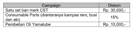 Di bulan suci Ramadhan, Yamaha mengajak konsumen untuk mengikuti program Berkah Ramadhan bersama Yamaha selama periode 1-30 April 2023. Program ini berlaku di seluruh bengkel resmi Yamaha di Indonesia. Berikut beberapa keuntungan yang ditawarkan pada program ini:
