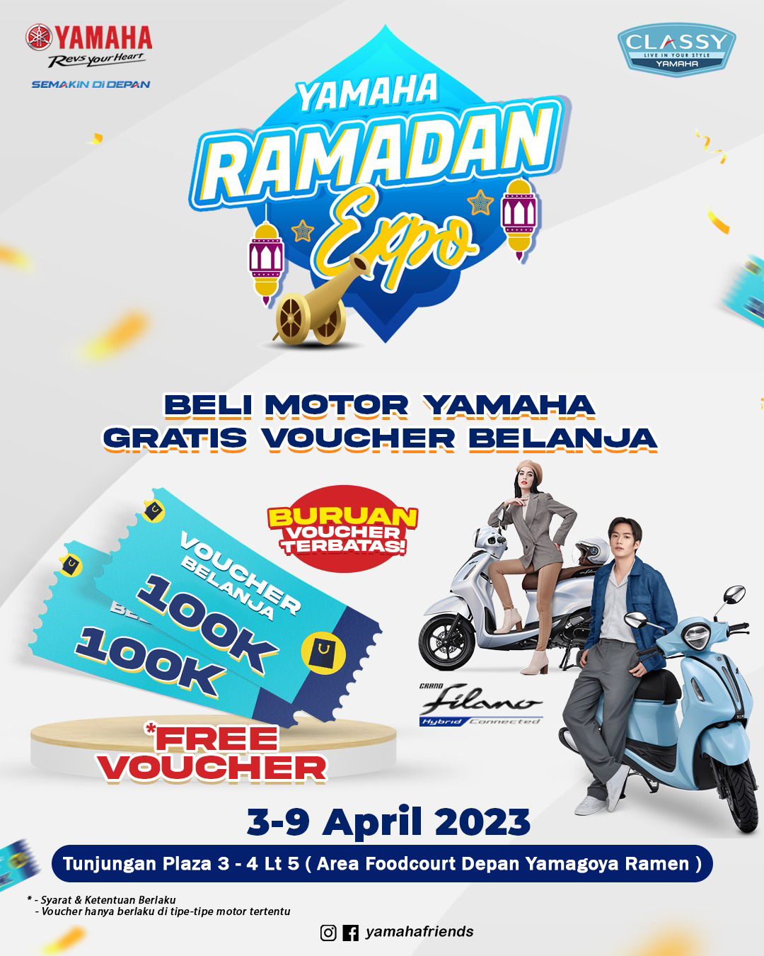 Dalam rangka menyambut Idul Fitri 1444 H, PT. Surya Timur Sakti Jatim (Yamaha STSJ) selaku main dealer motor Yamaha area Jawa Timur, Kalselteng, Kaltim, dan Nusa Tenggara menghadirkan Yamaha Ramadhan Expo. Pameran ini hadir di Tunjungan Plaza 3-4 Lt 5 (Area Foodcourt depan Yamagoya Ramen) dan berlangsung hingga tanggal 9 April 2023.