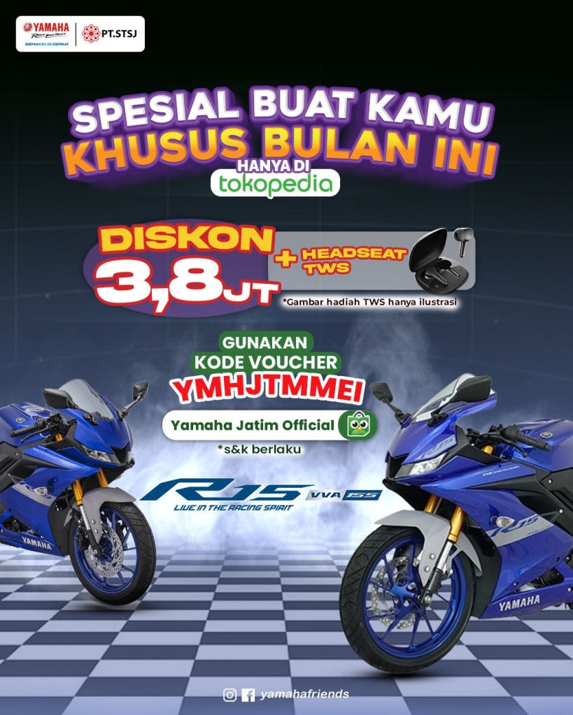 Read more: Spesial Mei! Yamaha Siapkan Diskon Gede Bagi Para Pecinta Motor SportSpesial bagi konsumen yang melakukan transaksi melalui akun E-Commerce Tokopedia Yamaha Jatim Official, berkesempatan menikmati potongan harga hingga Rp 3.8 juta. Selain itu Yamaha STSJ juga menyiapkan hadiah spesial berupa headset TWS khusus bagi konsumen yang melakukan pembelian melalui E-Commerce.