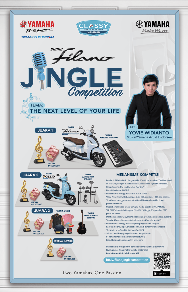 Selain membawa produk unggulan di kelasnya, Grand Filano Jingle Competition juga menggandeng seorang musikus ternama Indonesia, Yovie Widianto sebagai juri utama yang sudah berpengalaman dan berkecimpung di dunia musik Indonesia. Setiap karya musik yang masuk akan dilakukan penilaian oleh juri utama dan tim Yamaha hingga mendapatkan karya terbaik. Hasil karya musik terbaik dari para pemenang jingle competition akan disebarkan melalui media promosi Yamaha seperti Iklan TVC, Challenge, Konten Media Social, dan lainnya. Selain itu, Yamaha juga menyediakan total hadiah puluhan juta rupiah untuk hasil karya terbaik pilihan juri dan tim Yamaha, di antaranya: