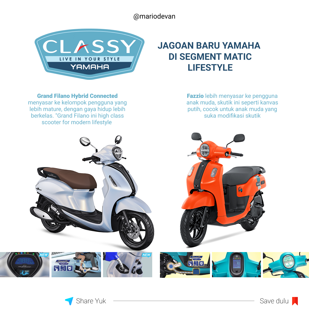 Setelah sukses dengan varian Maxi-nya, Yamaha kembali hadir dengan memperkuat lini produknya di segment matic, lewat Varian Classy, Yamaha tentu sadar perlu peluru baru yang lebih kuat buat segment matic, tidak bisa lagi berharap terlalu lama terhadap Mio, Fino, dan harus mengambil langkah cepat membaca trend market, dan menurut madev Yamaha cukup jenius disini, melihat meningkatnya demand vespa matic, Yamaha hadir dengan solusi yang jauh lebih murah dan terjangkau, tapi dengan kualitas dan fitur melimpah ala pabrikan jepang, hasilnya?? BOOMING!!
