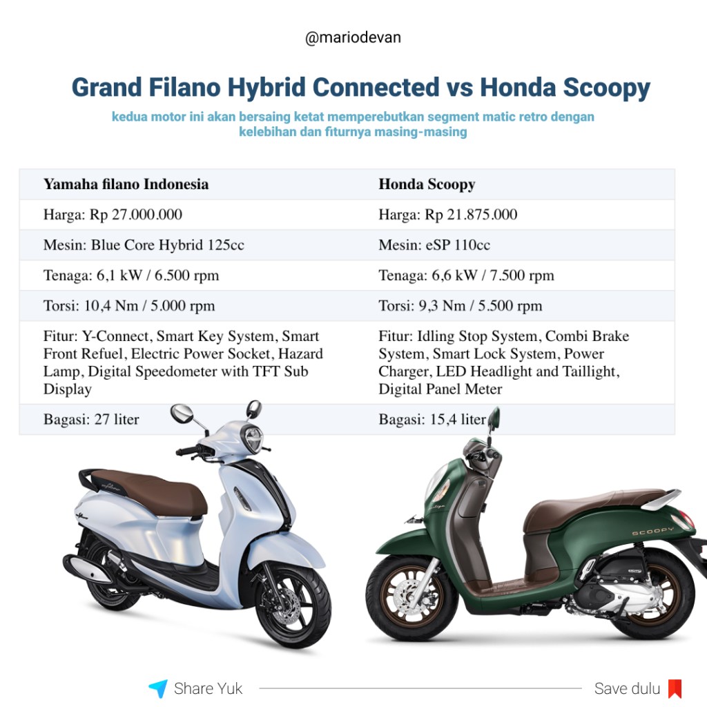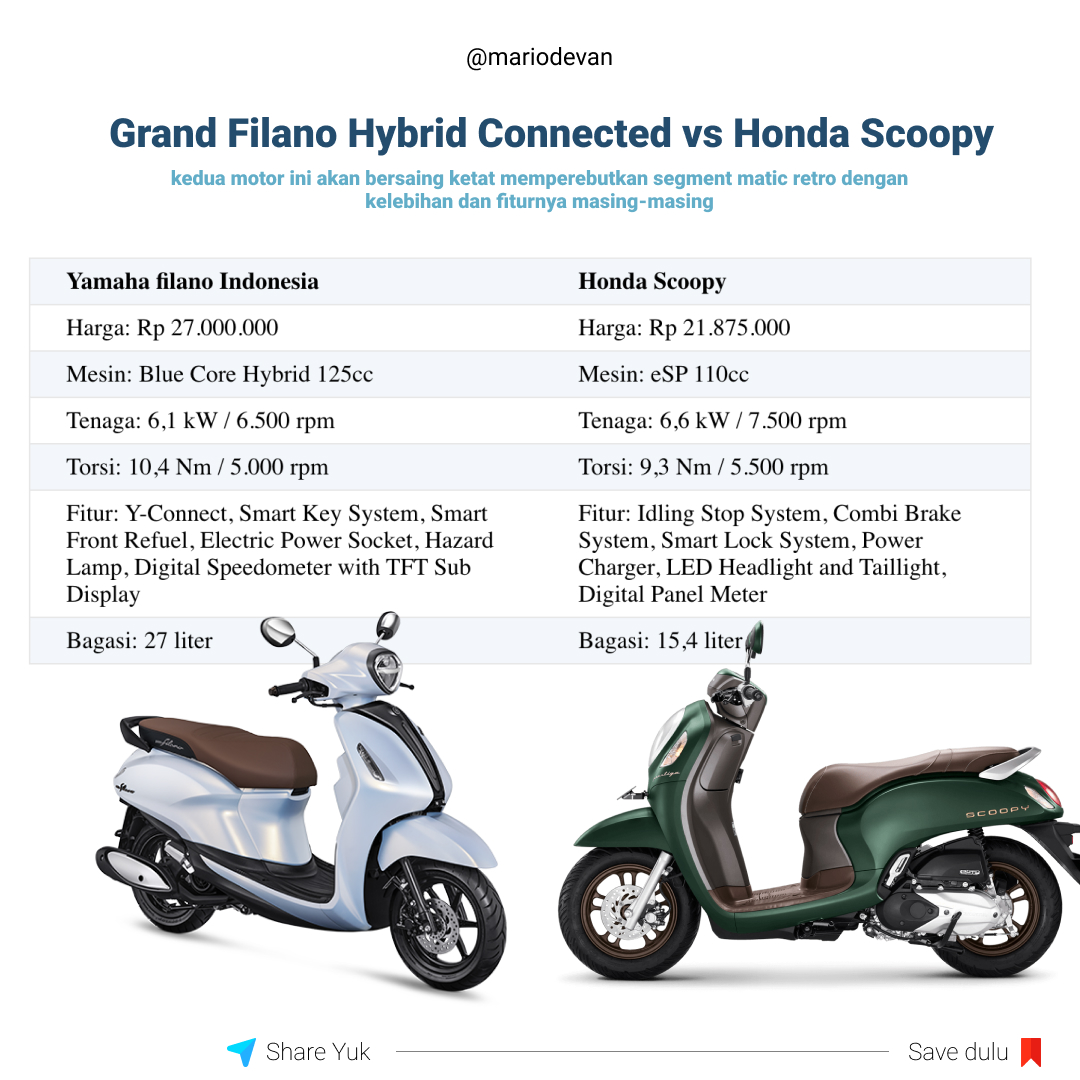 Honda Scoopy adalah salah satu pesaing utama Yamaha filano Indonesia di segmen motor matic retro. Berikut ini adalah komparasi antara keduanya: