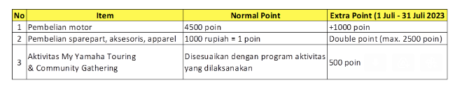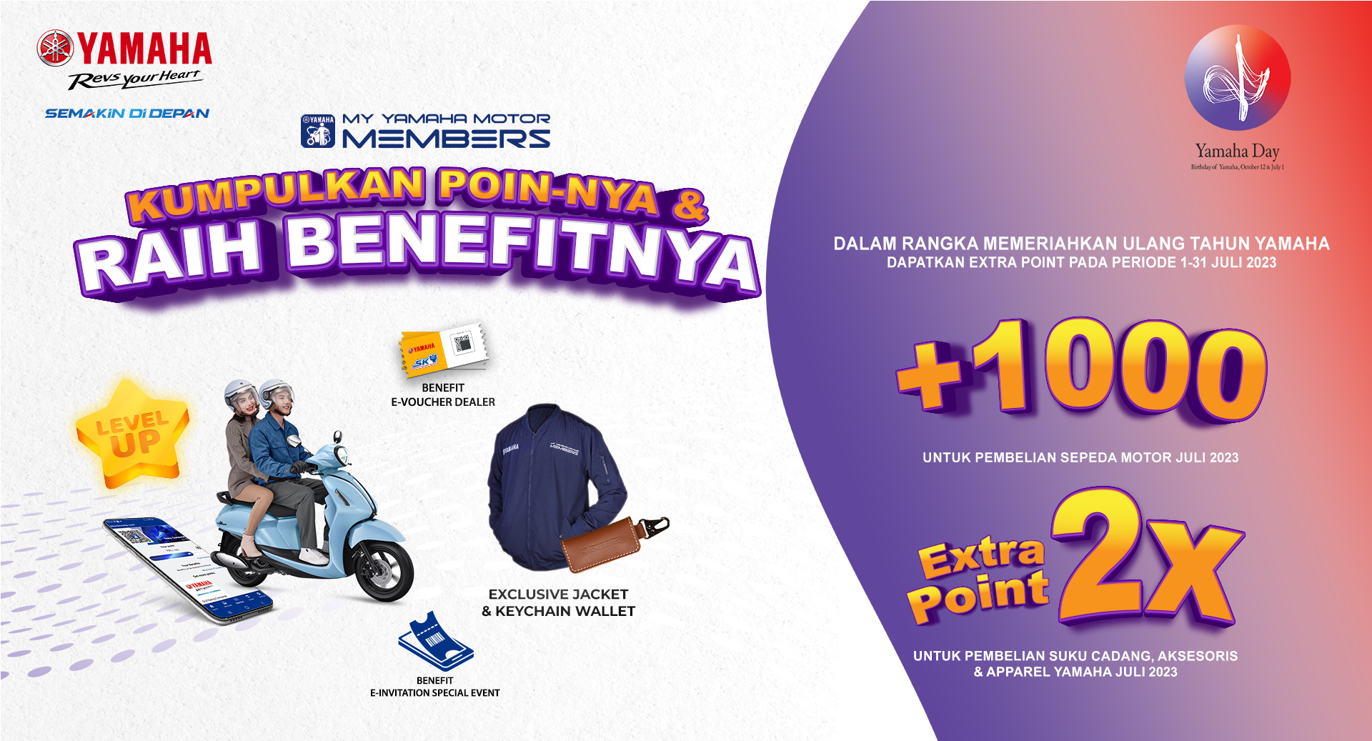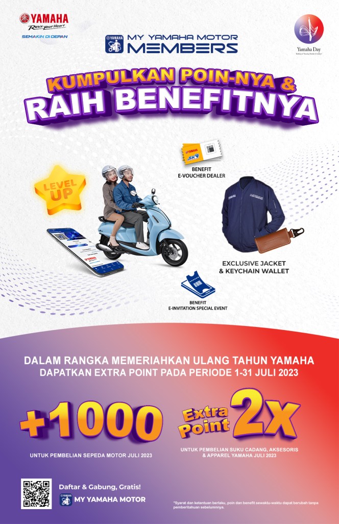 Yamaha membuka kesempatan istimewa bagi masyarakat luas khususnya konsumen setia Yamaha di bulan Juli ini. Mereka bisa mengikuti My Yamaha Motor Members campaign dengan bonus extra point untuk setiap transaksi pembelian produk-produk Yamaha pada periode 1 Juli-31 Juli 2023 di dealer-dealer resmi Yamaha. Peluang ini tentunya jangan terlewatkan untuk mendapatkan benefit yang tersedia selama bulan Juli itu.
