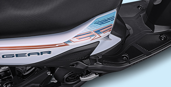 Bagasi di bawah jok Yamaha Gear juga cukup luas, sehingga dapat menampung berbagai barang bawaan. Pijakan kaki belakang yang bisa dilipat juga sangat berguna untuk memudahkan saat membonceng penumpang.