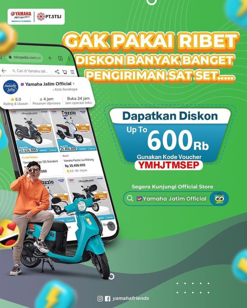 Program ini dapat dinikmati hanya dengan menggunakan kode voucher YMHJTMSEP di official store Yamaha Jatim Official. Konsumen dapat menikmati potongan harga untuk tipe unit yang masih tersedia di akun e-commerce. Selain itu, konsumen juga bisa menikmati fasilitas lainnya seperti same day delivery, hingga gratis biaya kirim.